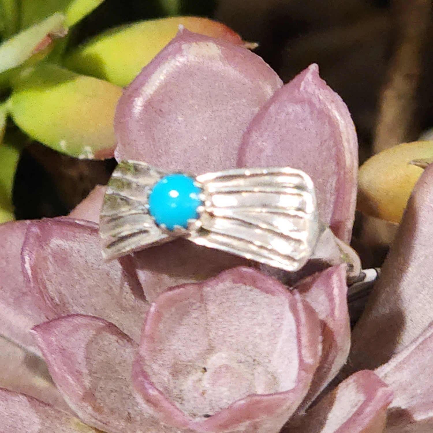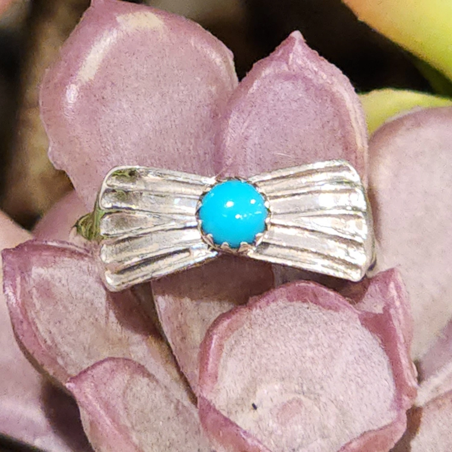 This is such a cute little silver and turquoise ring. We love the bow look that the silver and turquoise make on this ring.