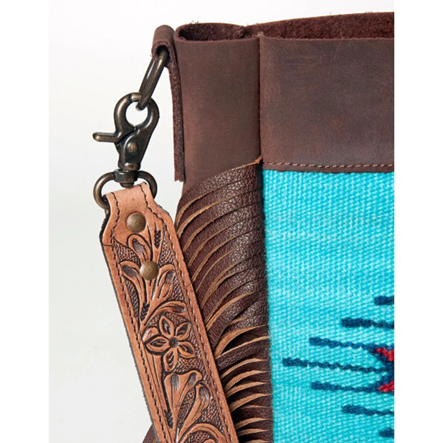 This bag is so rich looking! Love the dark brown mixed with the turquoise Aztec print! Great for shopping or a night on the town!