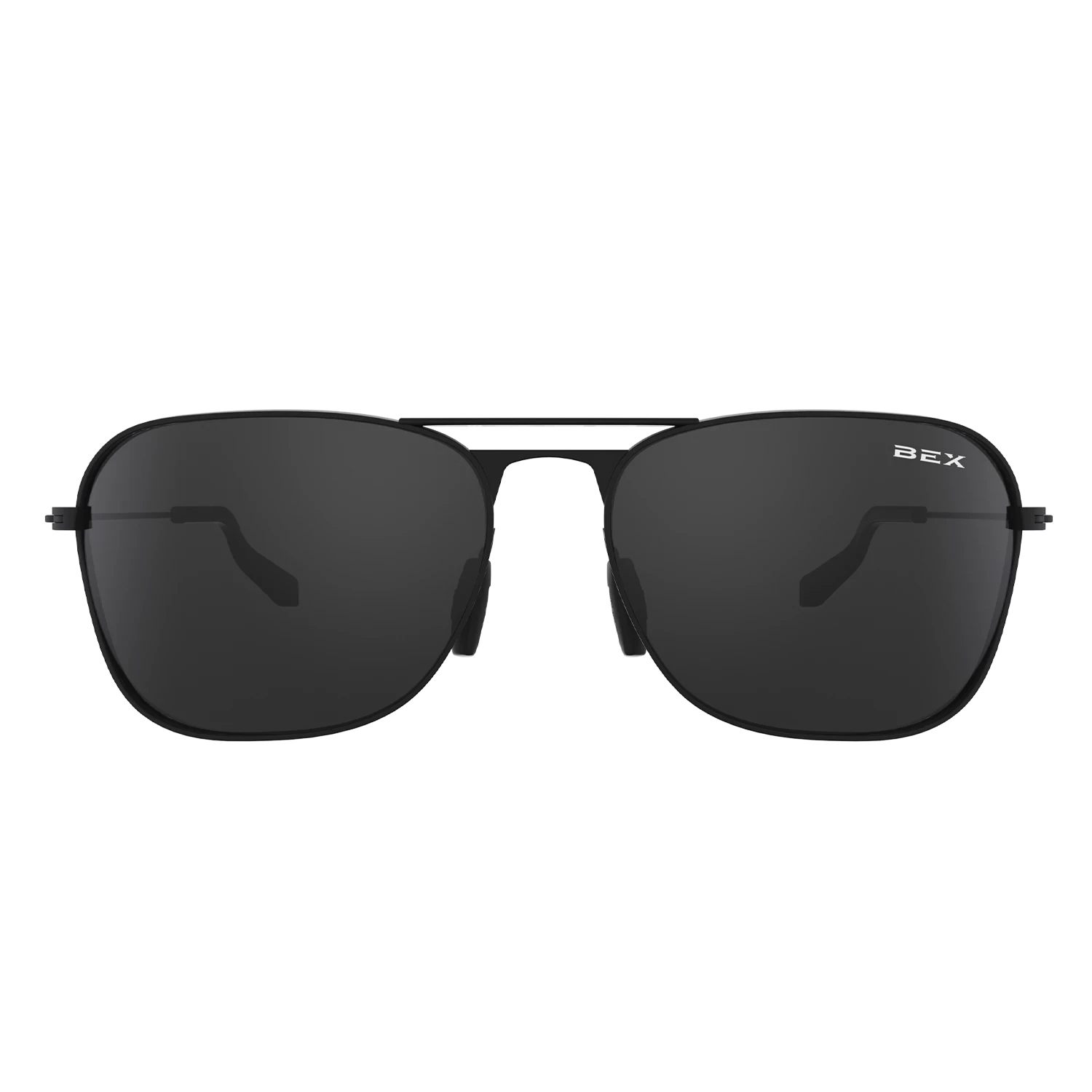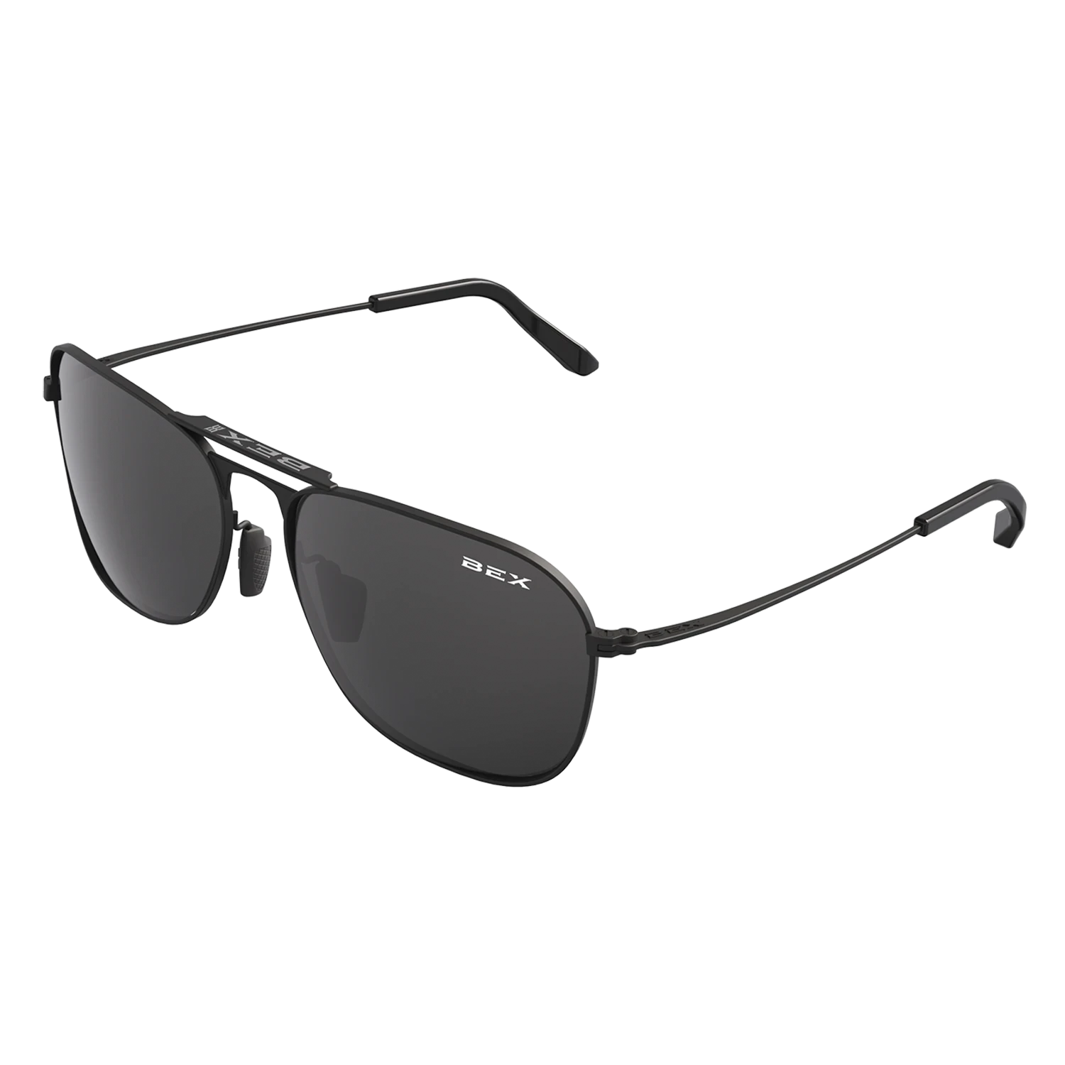 These Ranger Black & Grey sunglasses have a matte stainless steel frame with black accents. The lens is a BEX Live Gray tint.