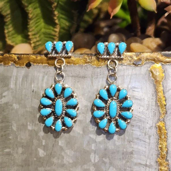 These are a stunning pair of turquoise cluster dangles. They are a post style earring with all the style and class you will want from these 14 stone dangles.Â