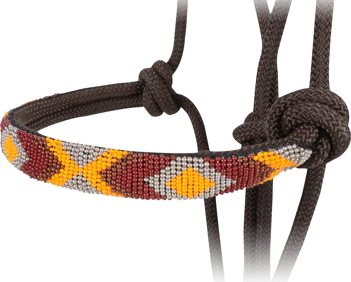 Beautiful beaded noseband on a durable nylon/poly body with an attached 9’ lead. One size fits most. Chocolate Rope Halter. Gray/Yellow/Burgundy beaded nose band.