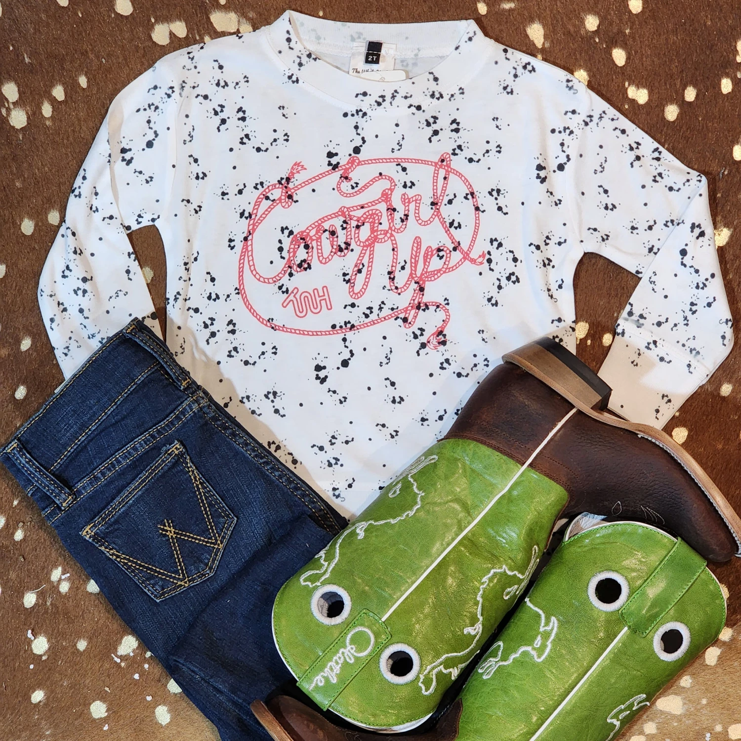 How cute will your little cow gal be in this cute black and white long sleeve shirt. Light weight and ultra soft, in between a long sleeve shirt and sweatshirt.