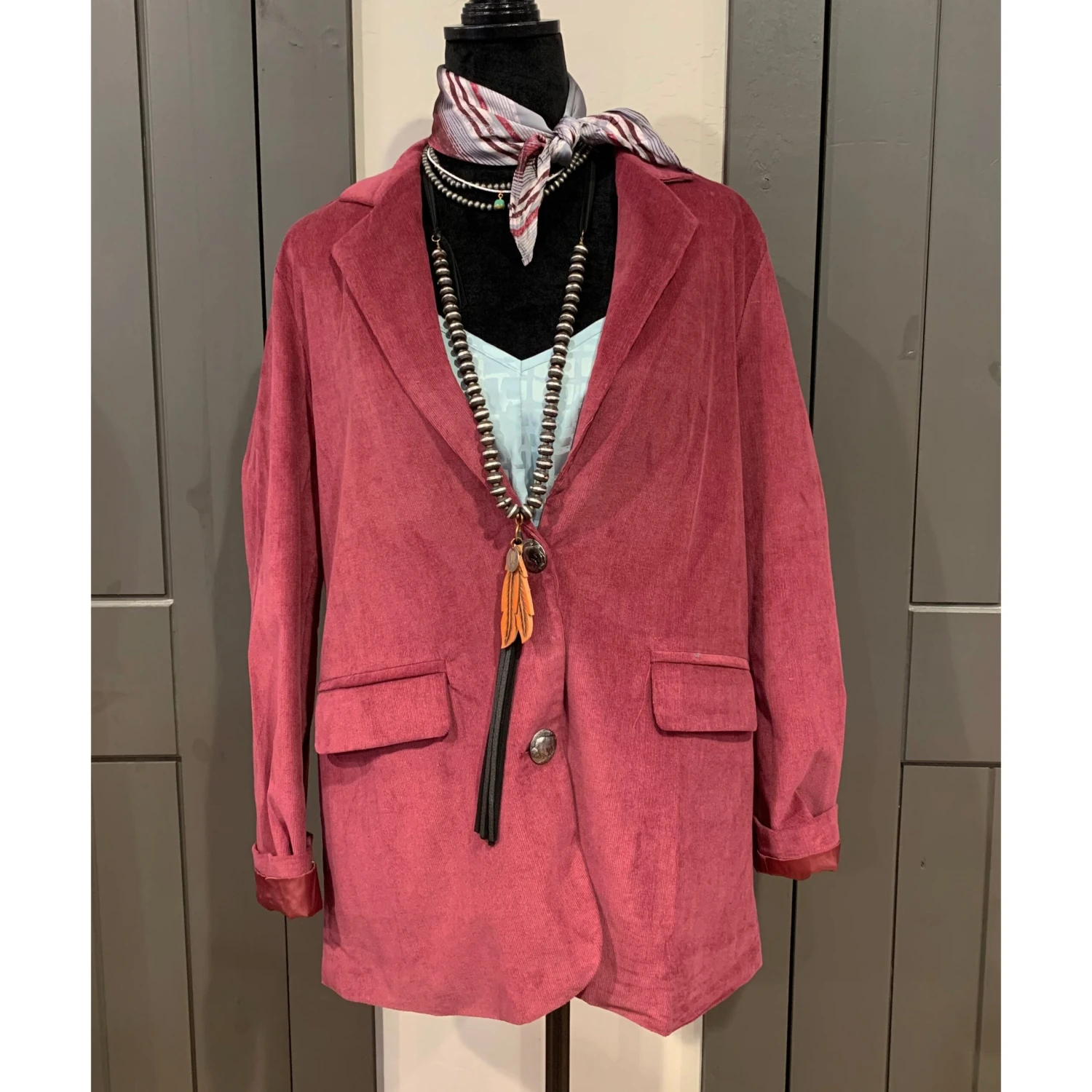 This cute grey and cranberry skinny wild rag is a great fashion statement. It can be used around the neck or also would be super cute tied up in your hair.