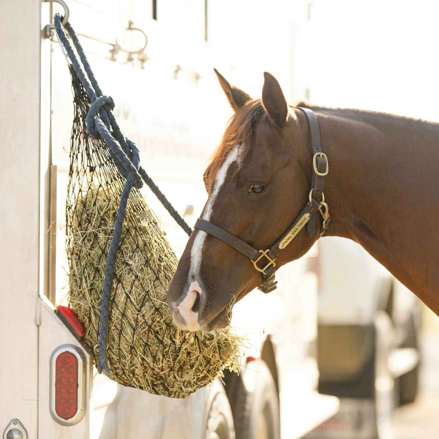 The Hay Chix Half Bale Net attaches easily to a trailer, eye hook, fence or tree, it’s perfect for feeding on the go. This net holds about 1/2 of a small square bale (4-6 flakes.)Â