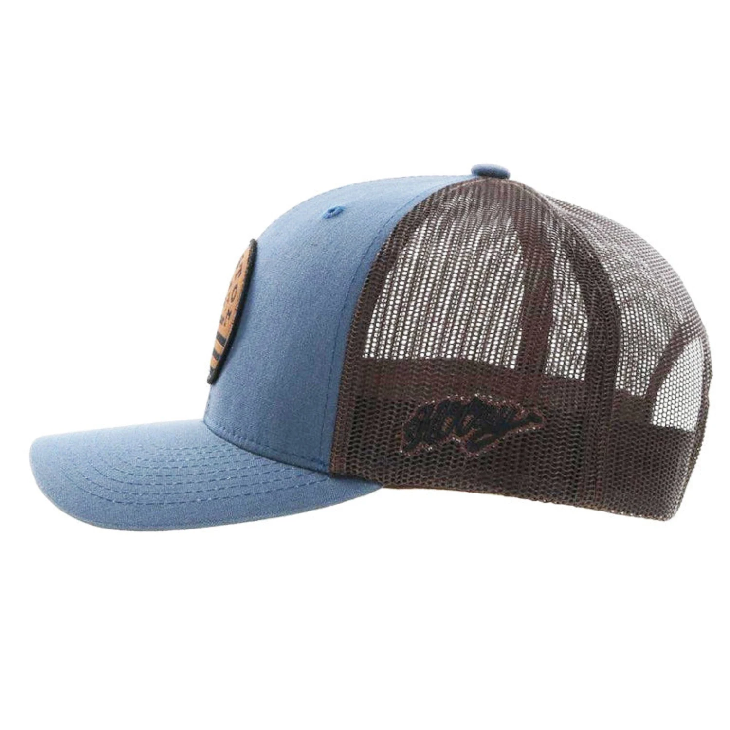 This cap is offered in a mid-profile 6-panel body style with a curved bill. The front and bill are blue denim with a brown mesh back for ventilation. There is an adjustable backstrap with a Hooey tag. Resistol America brown/black patch. Brown HOOEY on brown side panel.