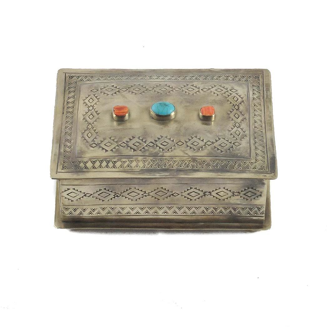 This small, stamped box is the perfect “catch all” for your small jewelry or favorite memories. It’s lined with velvet and adorned with turquoise & spiny oyster.