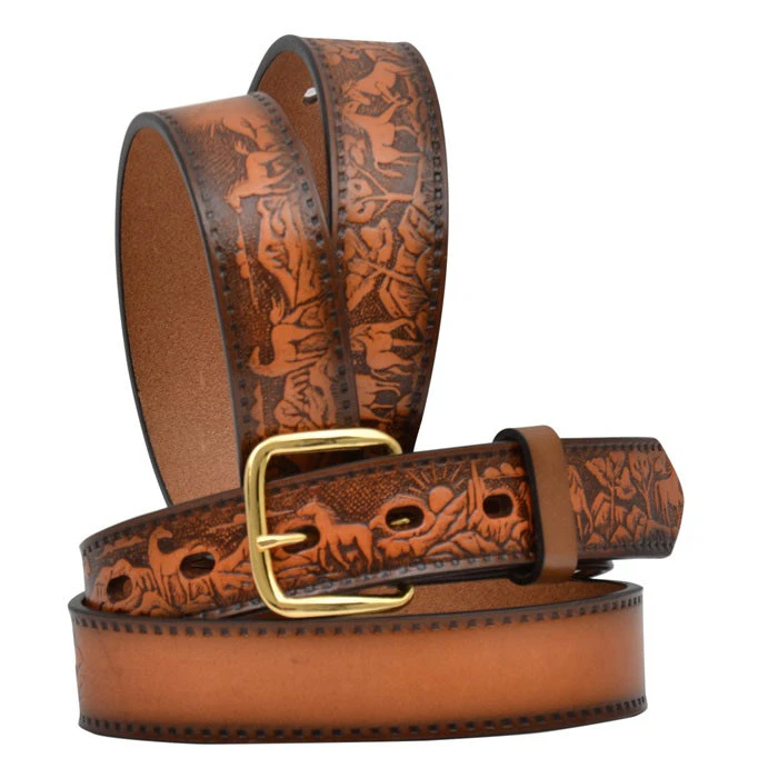 This kid’s belt from 3D Belt Company features a engraved horses throughout the belt. The middle of the belt has a blank leather spot, perfect for engraving names into.Â