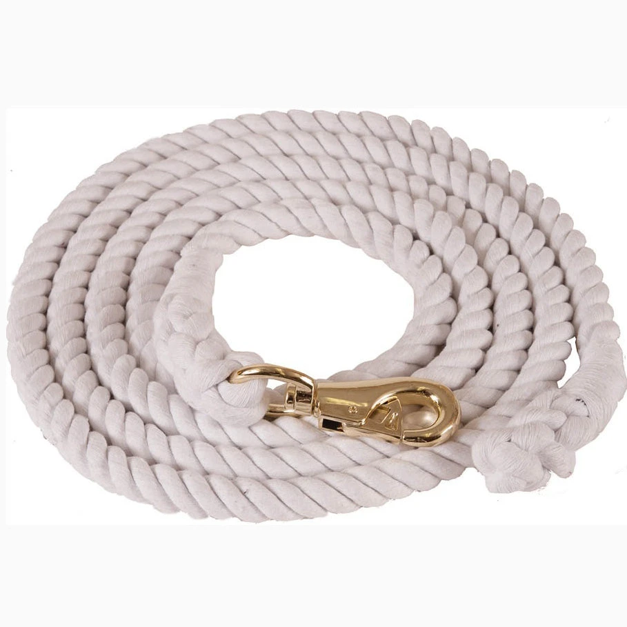 This white cotton lead rope from Mustang is 10′ long by 3/4″ wide! It also has a 1″ brass plated bull snap!