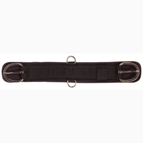 This pony cinch from Mustang is a straight back nylon cinch with PVC backing! PVC is very easy to clean and keeps the pony from chaffing and soreness!Â