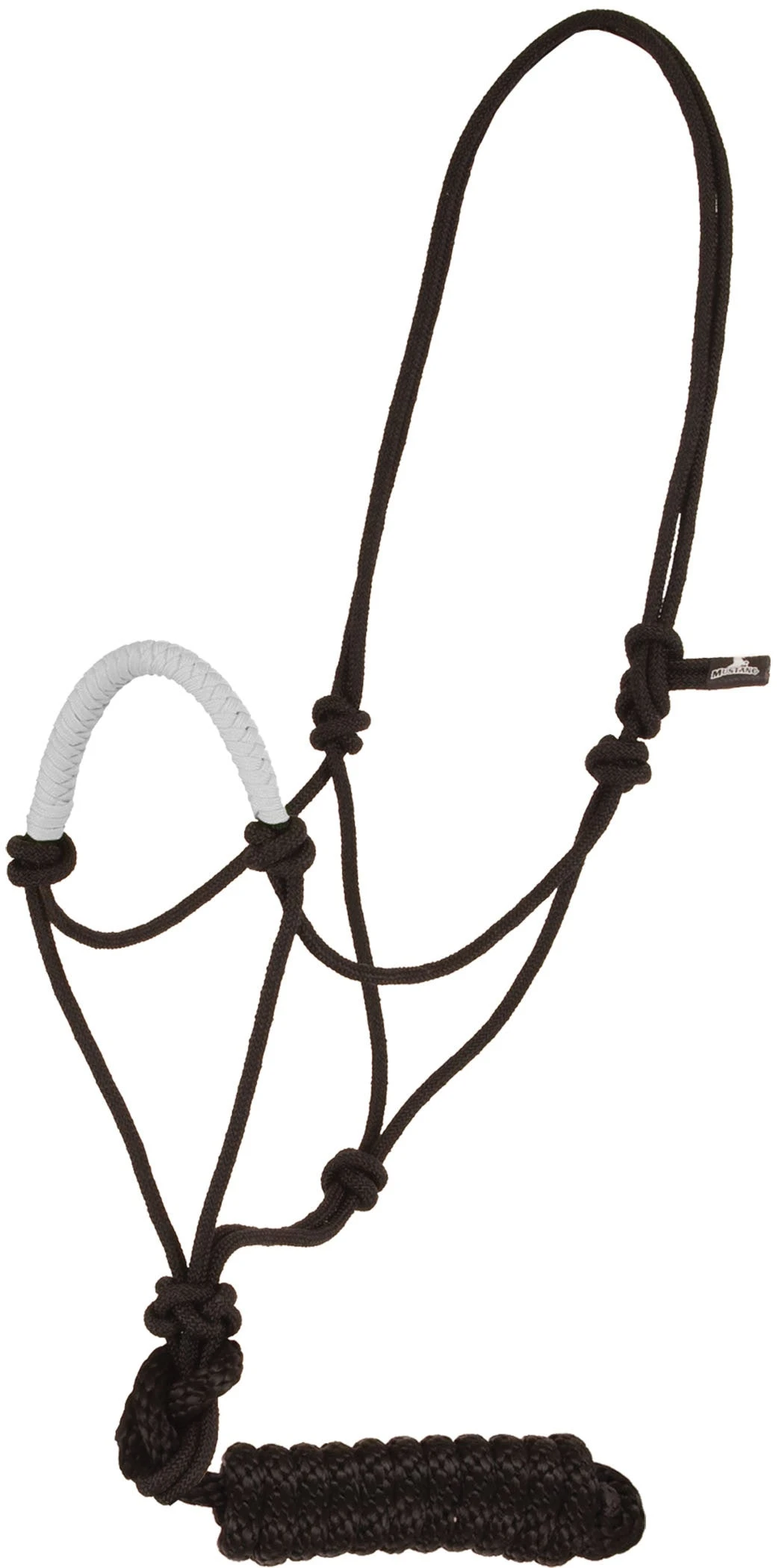Rope halter is made from a continuous piece of rot resistant 3/8″ diamond braided poly rope with a solid color nose accent ad a 5/8″ x 8′ detachable lead. Long lasting and washable with no hardware.