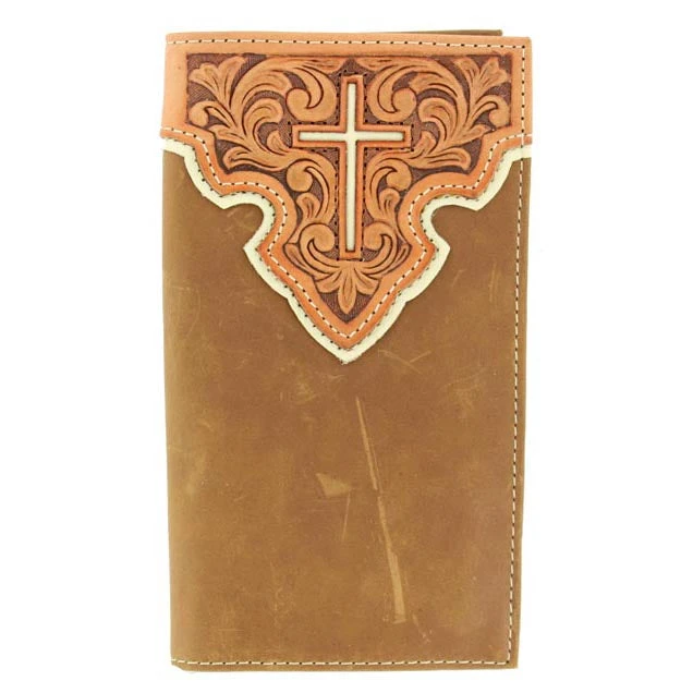 This is a great wallet for any cowboy. It features tan leather with a tooled overlay with a cross in the center.