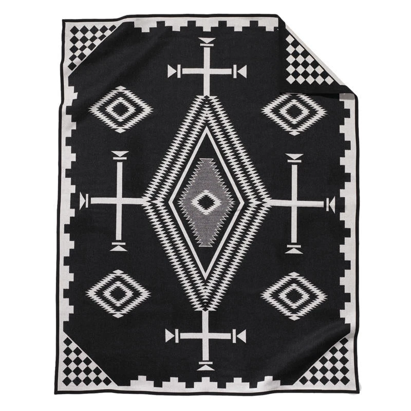 Spanish crosses, diamond-shaped “eyes” (ojos) and the symbols of the Navajo Four Mountains of Creation are dramatic in any setting. The design reverses from black background to white–an achievement possible only in mills as technologically advanced as ours.
