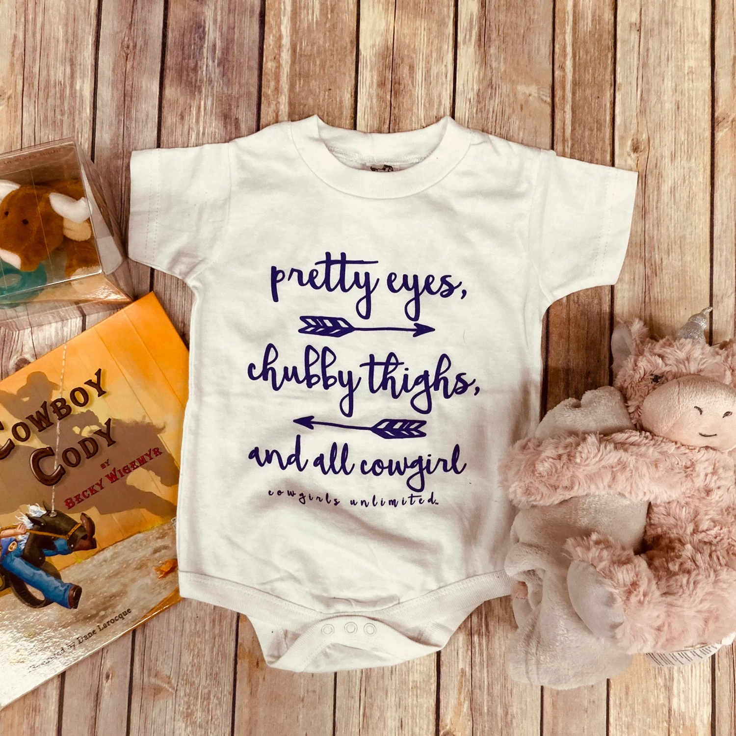 This “pretty eyes, chubby thighs, and all cowgirl” onesie is so cute and the phrase couldn’t be truer. Lets be honest every little cowgirl we know needs it! Â