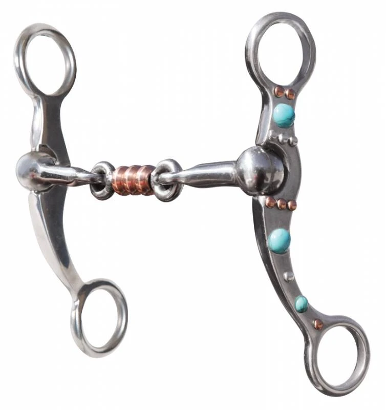 This weighted cheek allows for more control and added poll pressure while maintaining clean lateral movement. The cheek pieces are polished steel with decorative silver and turquoise designs.
