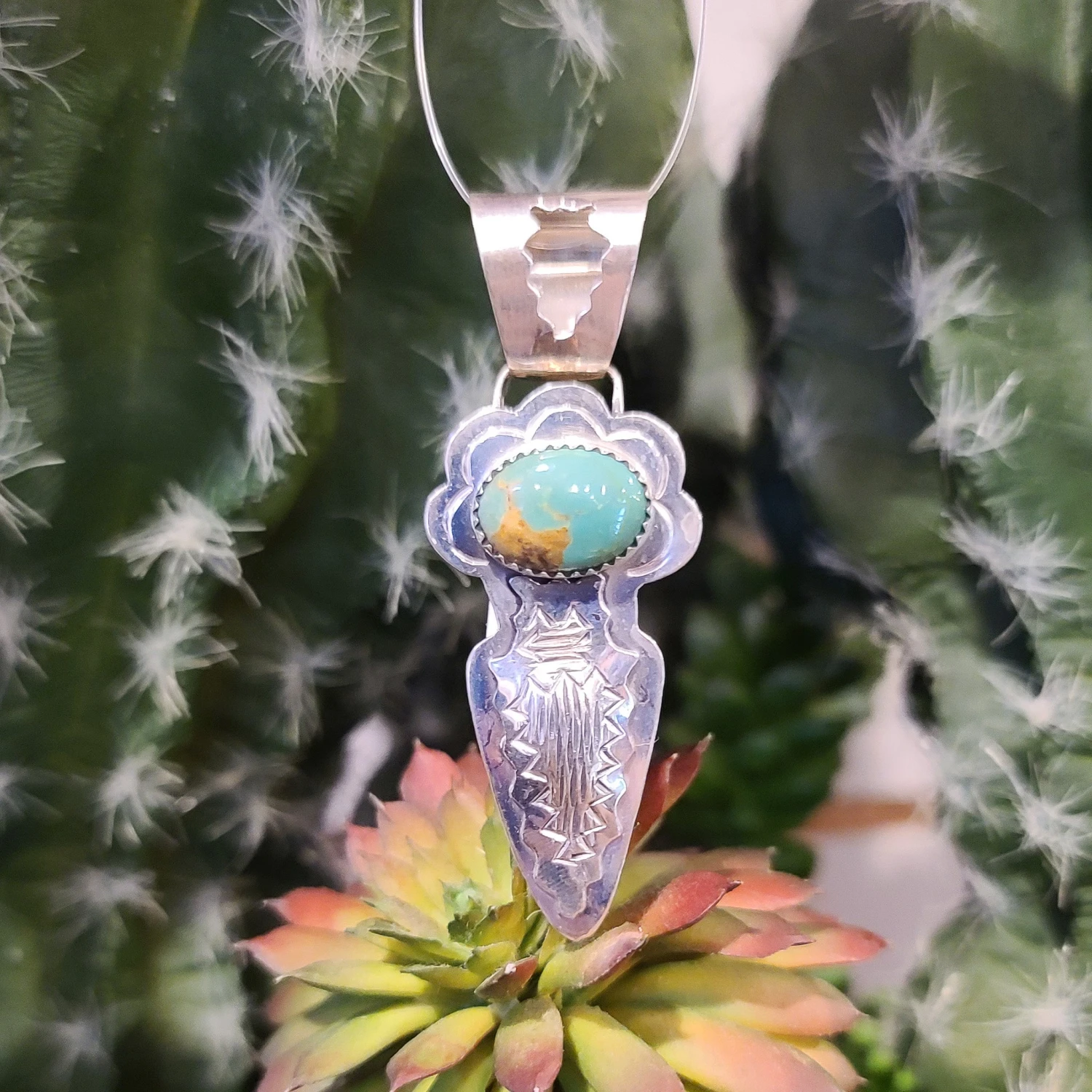 We just love this Royston turquoise pendant. The unique silver work and the color of the stone really complement one another.