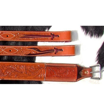 This back cinch has detailed acorn tooling with roller buckles. Fully equipped with 3/4″ billet straps and girth connector. Roller buckles make this cinch easy to adjust.Â