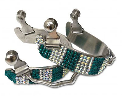 Ladies bling rhinestone bumper spurs. These spurs feature crystal rhinestones on a 1″ nickel plated band and have a 3″ boot width.Â