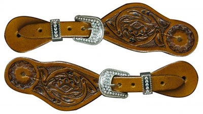 Youth floral tooled spur straps with crystal rhinestone buckles. Adjusts 7.5″ to 9″