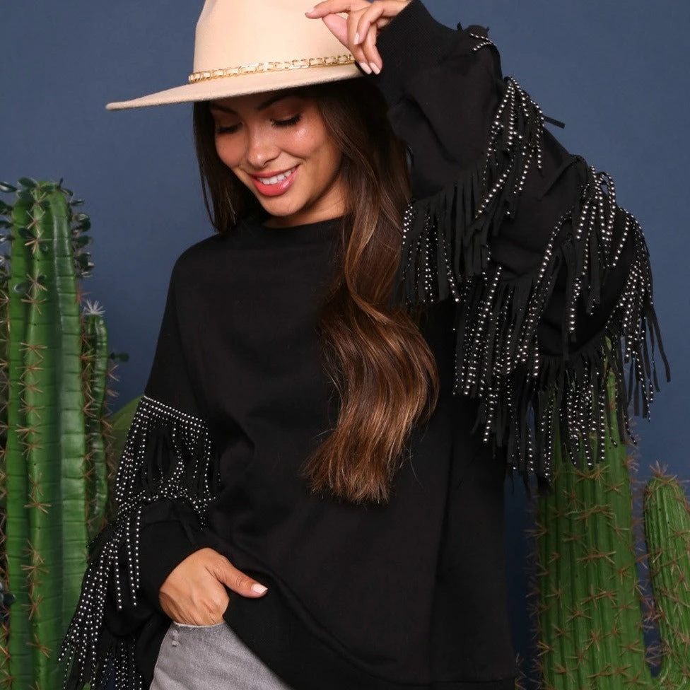 These sleeves are EVERYTHING. It is a baggy fit. Round collar neck line. The metallic studs on the fringe is one of the best smaller details.Â