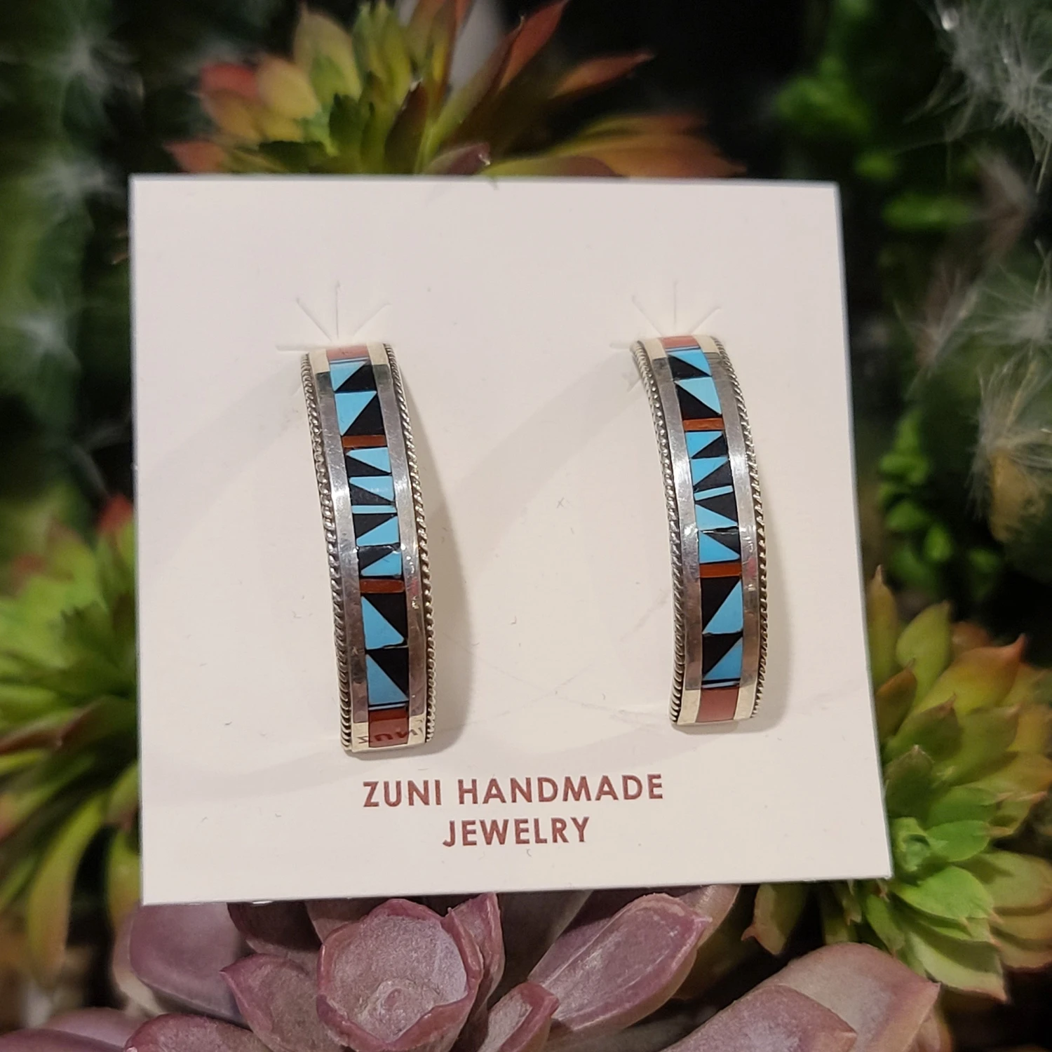 These are a beautiful set of Zuni inlay half hops. These are post style earrings and are light weight and easy to wear.Â